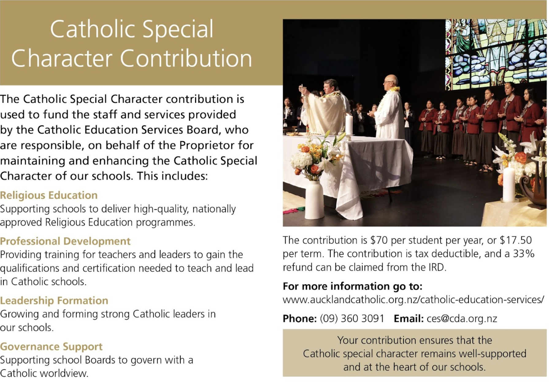 Families facing financial difficulties can contact their school office, their Parish Priest, or Auckland Common Fund Ltd at the Catholic Diocese of Auckland on 09-360-3040 for further information.