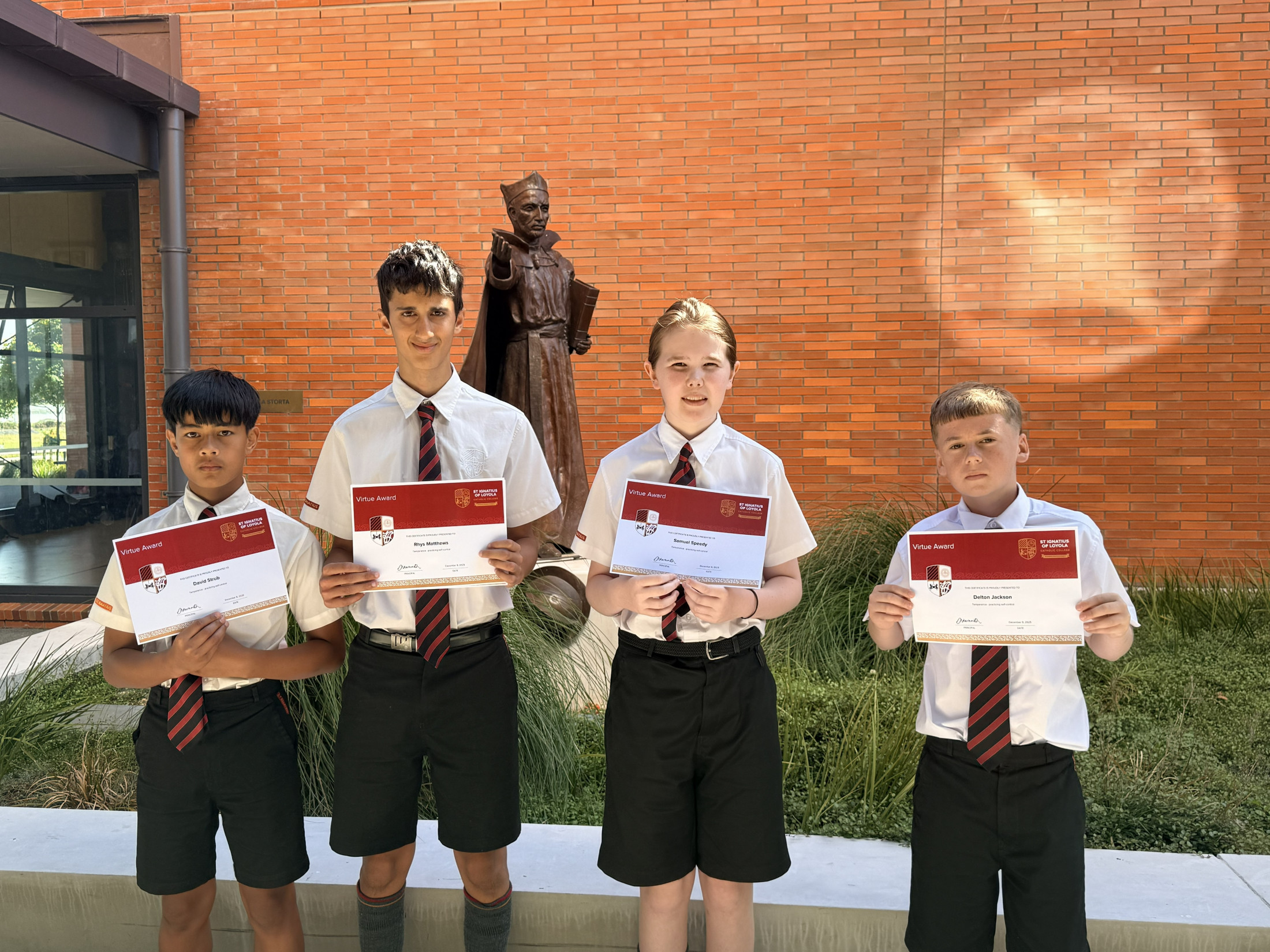 We then acknowledged those students nominated by staff for consistently demonstrating one of our seven virtues: the three Theological Virtues of Faith, Hope, and Love, and the four Cardinal Virtues of Prudence, Fortitude, Temperance, and Justice. These virtues lie at the heart of our Catholic character, and when we live them out, we show that we are directing our lives toward God.